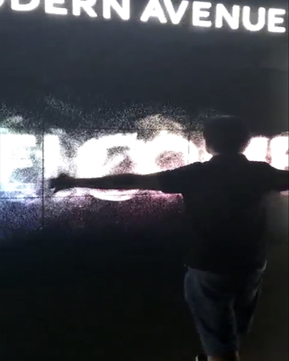 ★沒有人的時候就是一個靜態(tài)的LOGO,有人走過時組成LOGO的粒子被打散隨后又聚合一塊,形成非常炫酷的粒子效果,極大的增強了互動性和品牌宣傳的效果。